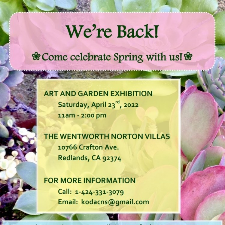 Wentworth Norton Group and GCSS member Dr. Rosabel Young is proudly hosting a small initial Springtime art and garden party at her Wentworth Norton Villas in Redlands California. The gardens will be open to the public over the Redlands Bicycle Classic weekend for the first time in a while and it offers a peaceful respite in the middle of a 5-acre orange grove from the inevitable downtown traffic jam.