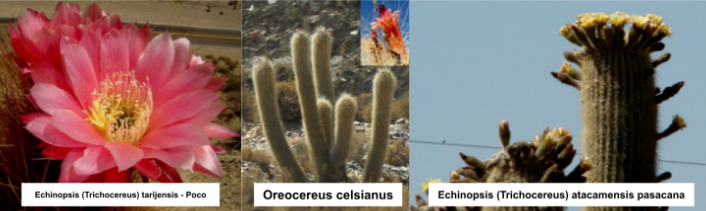 Otherwise known as the Giants of the Andes, many of them are among the largest cacti on earth, rivaling the North American Saguaro (Carnegia gigantea) and Cardon (Pachycereus pringlei). We include all of the upright columnar shaped cacti in this group, whether they end up being huge or not. Genera such as Cleistocactus are included, just because they tend to grow in a columnar way. We do not include the ball shaped Echinopsis, but we do include all of the newly introduced Echinopsis from the Trichocereus genus that was subsumed recently. We will accept the old or the new names for these plants. Following are the genera from which these plants come: Armatocereus, Arrojadoa, Arthrocereus, Brasilicereus, Browningia, Calymmanthium, Castellanosia, Cereus, Cipocereus, Cleistocactus, Coleocephalocereus, Corryocactus, Echinopsis, Espostoa, Espostoopsis, Eulichnia, Facheiroa, Haageocereus, Harrisia, Jasminocereus, Lasiocereus, Micranthocereus, Neoraimondia, Oreocereus, Pierrebraunia, Pilosocereus, Praecereus, Stetsonia, Stephanocereus, Strophocactus, and Weberbauerocereus.